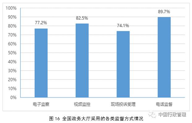 各地区在推进政务大厅建设的过程中,建立了较完善的监督机制,实现了对办事过程的立体式监控。77.2%的政务大厅建立了电子监察系统,82.5%的政务大厅开展了视频监控,74.1%的政务大厅设立了现场投诉受理区,89.7%的政务大厅提供了电话监督方式。在规范涉企收费方面,不少地方通过政务大厅实施“一个窗口收费”,要求进驻单位必须公开和严格执行收费项目及其标准,实行收费报批、集中收缴、统一划转、收缴分离,有效规范了进驻单位涉企收费行为。全国政务大厅建立一次性告知制度、工作人员行为规范制度的比例超过90%;建立限时办结制度、首问负责制度、投诉处理制度、责任追究制度的比例超过80%。此外,近40%的政务大厅建立了超时默许制度,在事项办理超过承诺时限后启动该程序,24小时内办结。上海、江苏、浙江、福建等地还探索推行窗口受理无否决权制度。