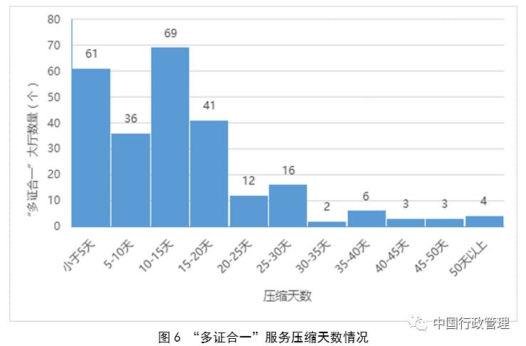 “多证合一”改革取得明显成效。政务大厅积极落实“先照后证”、“多证合一”等商事制度改革,多地大厅设立了商事登记业务办理专区,将工商、税务、质检等相关部门窗口集中在一起,汇总填报表格,提供企业名称预核准、企业登记注册等服务快速通道,显著缩短办理时限,积极为促进“大众创业、万众创新”助力。普查显示,“多证合一”前,企业登记的平均办理时限为16.8天,“多证合一”后缩短至3.4天,压缩幅度达79.8%。如,河南省大力推进“35证合一”,在政务大厅实行“一表申请、一窗受理、一网归集、一键推送”工作模式,可在1至3个工作日内办结企业设立登记。