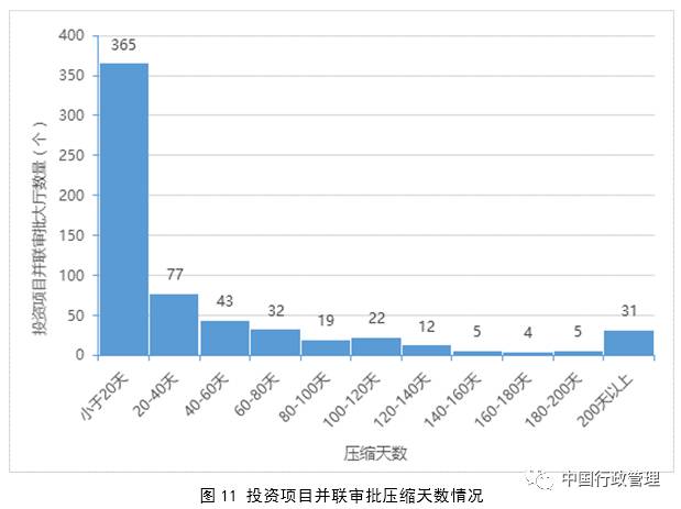 深化并联审批改革。为提高行政审批效率,减少权力寻租,方便企业和群众办事,各地普遍开展并联审批,统一受理涉及多部门的投资项目审批事项,取得了明显成效。普查发现,投资项目并联审批事项平均涉及6个部门,其中124个事项涉及部门超过10个。实行“并联审批”将平均办理时限由65.5天缩短至21天。如,四川省达州市投资建设项目报建审批由1042天缩短至60天,压缩了982天(约为2.7年)。此外,各地政务大厅针对多个部门业务流程普遍存在评估、审图、实地查勘等费时较多的环节,创新提出“模拟审批”、“多评合一”、“多图合一”等方式,进行联合办理,显著提高了审批效率。如,江苏、福建等地开展模拟审批,实现后置部门提前介入;江苏省镇江市推行“多评合一”改革,项目评估审批周期由141个工作日缩短到50个工作日以内,压缩比例64.5%;江苏省盐城市在政务大厅推行“七图”联审,加强市县两级图纸审查联审联动,施工图联审由40多个工作日,压缩为7个工作日。